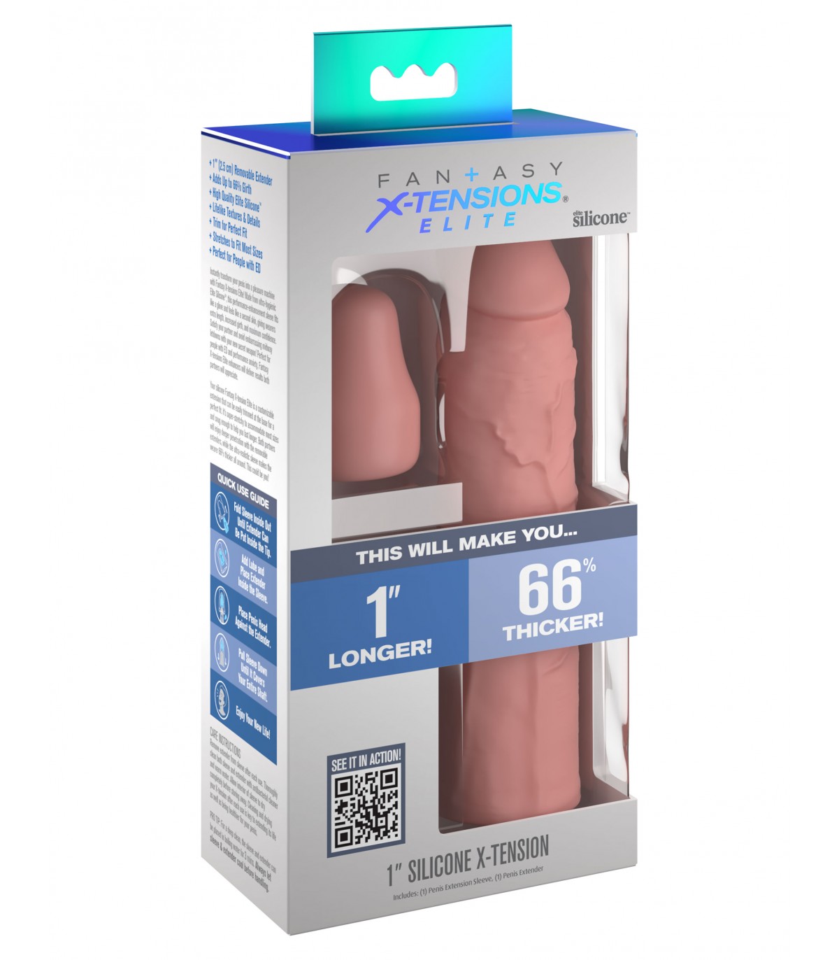 Instantly transform your penis into a pleasure machine with Fantasy X-tensions Elite! Made from ultra-hygienic Elite™ silicone, this performance-enhancing sleeve fits like a glove and feels like a second skin, giving users extra length, increased girth, and ultimate confidence. Satisfy your partner and avoid embarrassing mid-ride disappointments with your new secret weapon! Perfect for those with erectile dysfunction and performance anxiety, Fantasy X-tensions Elite enhancers will deliver results that both partners will appreciate. Your silicone Fantasy X-tension Elite is a customizable extension that can be easily trimmed at the base for the perfect fit. It’s super stretchy to fit most sizes and comfortable enough to help you last longer. Both partners will enjoy deeper penetration with the removable extenders, while the ultra-realistic sleeve makes the wearer 66% thicker in every way. This could be you! • 1″ (2.5 cm) removable extender • Adds up to 66% girth • High quality Elite™ silicone • Realistic textures and details • Trimmable for a perfect fit • Stretches to fit most sizes • Perfect for people with ED Measurements: 17’78 cm x 4’78 cm.