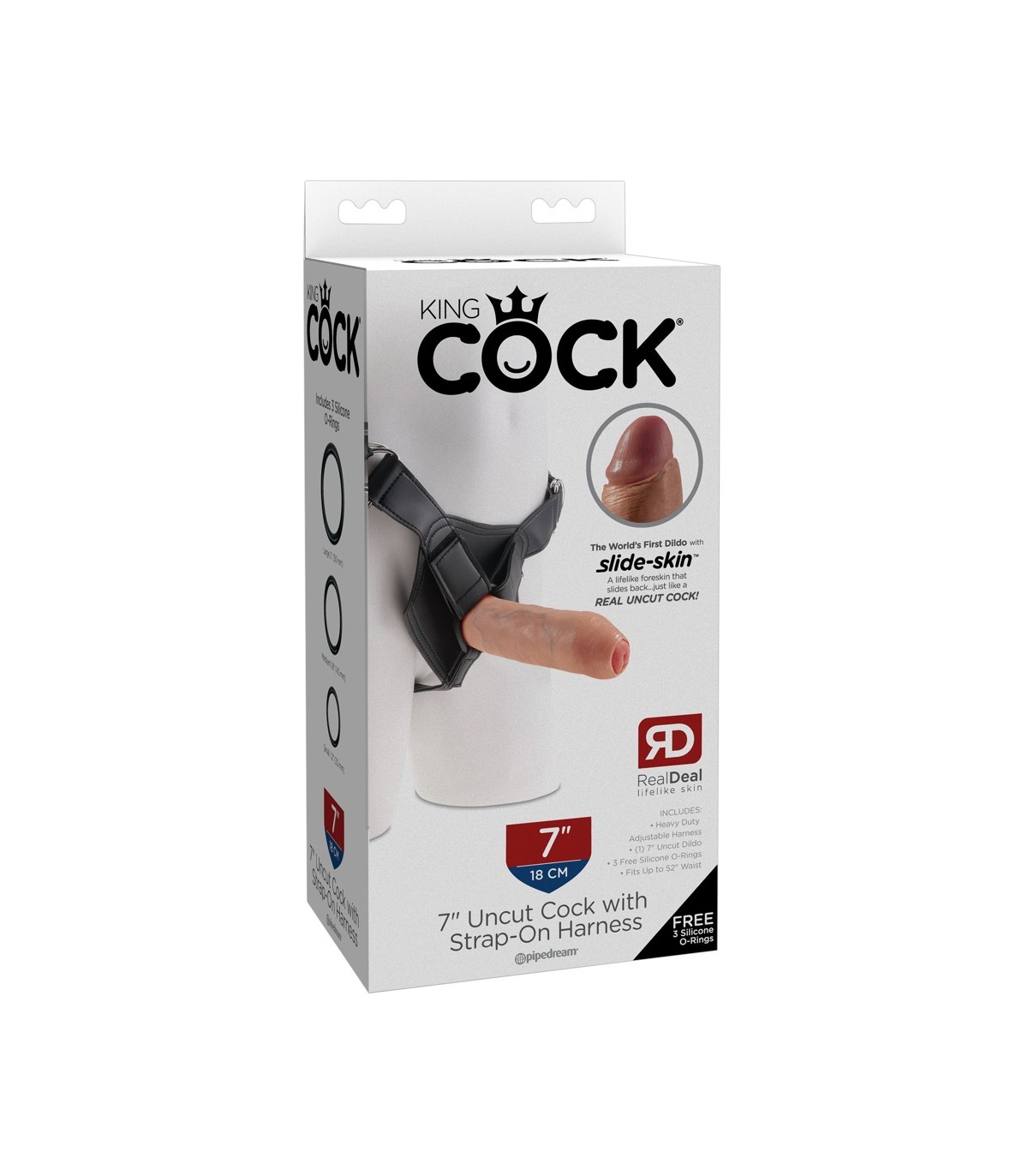 When you want an incredibly realistic strap-on experience, this King Cock® Uncut Strap-On Harness will fulfill your fantasy with a realistic movable foreskin that slides back just like a real, uncut penis. The flexible shaft and foreskin are exquisitely handcrafted to deliver intensely stimulating sensations. The wide, suction-cup base fits snugly into the harness for a secure fit and can even be used without the harness. Stick it to any smooth, flat surface for wall-banging fun. Made in Pipedream’s state-of-the-art rubber manufacturing facility. The heavy duty vinyl harness keeps everything securely in place even when the action heats up. The form fitting design hugs the contours of your body and gets even softer and tighter with each wear. Featuring a thong strap and fully adjustable waist straps, it comfortably fits waists up to 52″. Metal belt buckles ensure no loosening during the fun, while Velcro straps keep the O-ring firmly in place. Gently spot clean with toy cleaner and warm water and lay flat to dry. 18 cm dildo.