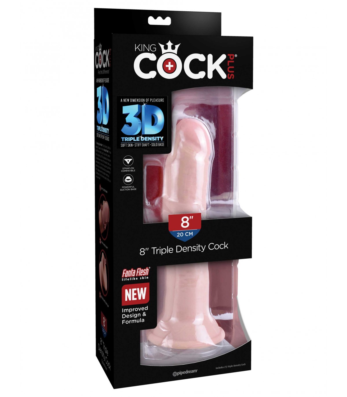 The 8″ triple-density King Cock® Plus is made from new and improved Fanta Flesh® material, making it rigid on the inside and soft on the outside. The realistic outer skin is smooth to the touch, while the inner shaft is rigid and erect like a real penis, making your pleasure experience as real as possible. The solid suction cup has been redesigned for greater adhesion, giving you more versatility and comfort during use. The suction cup also makes this triple-density 8″ King Cock® Plus harness compatible. • Greater realism • Soft skin with rigid shaft • Less odor • Improved suction cup stability • Wide base is compatible with Trap-On harness Measurement: 20 cm.
