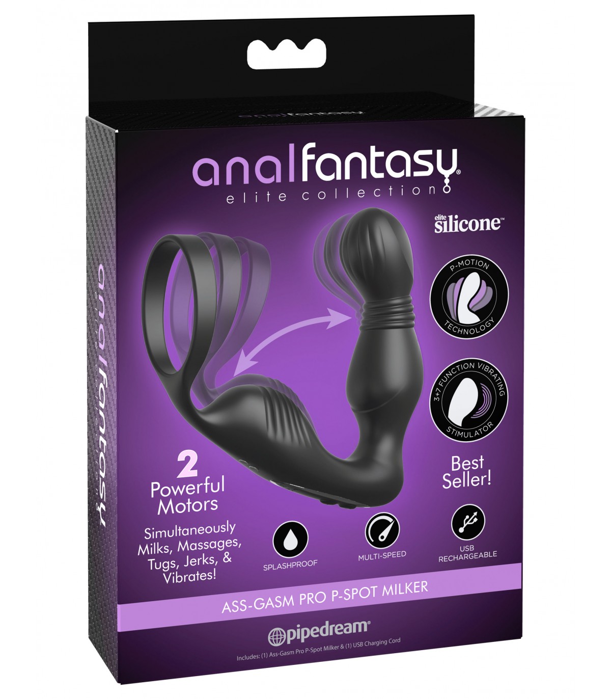 Experience the ultimate in prostate play with the incredible Anal Fantasy® Elite Collection Ass-Gasm® Pro P-Spot Milker. This unique prostate pleasure offers true innovation with a fully automated milking system to simultaneously caress your prostate and shake your perineum. The cleverly curved tip of the Ass-Gasm® Pro P-Spot Milker delivers “come hither” massaging motions that allow the base to rock back and forth and apply pressure against your perineum. The P-spot “milking action” rhythmically shakes the C-ring and your penis, delivering rock hard erections and the most explosive ejaculations every time! Your experience is further intensified by a powerful vibrating bullet located at the tip of the P-Spot Milker and featuring 3+7 exciting vibration patterns. The ergonomic design with a built-in C-ring gently tugs on your package and allows for optional use for solo sessions or for partner play. • Various speeds • 2 powerful motors • Splash resistant • USB rechargeable • Elite Silicone