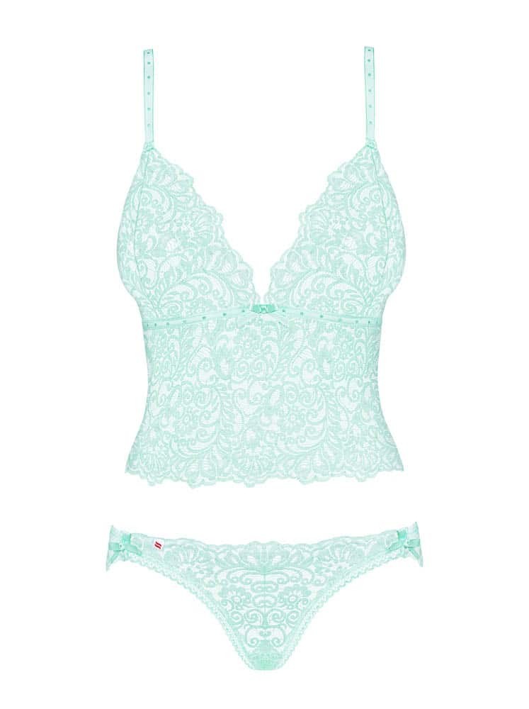 The bra top has adjustable straps and cups without padding or underwire. The matching brief has a high-cut back and leaves most of the buttocks free. The set is made of a nice soft stretchy fabric for a good fit.
