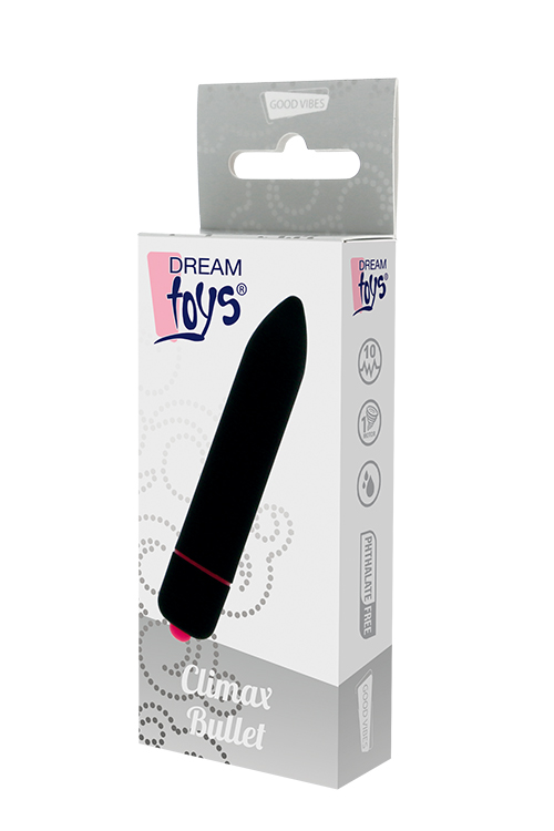 The Climax Bullet is a pocket size bullet vibrator with a powerful motor and 10 functions. The bullet has a smooth surface and a round tip for pin point stimulation. It is made of phthalate free ABS and can easily be operated with one button.