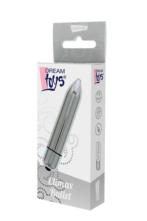 The Climax Bullet is a pocket size bullet vibrator with a powerful motor and 10 functions. The bullet has a smooth surface and a round tip for pin point stimulation. It is made of phthalate free ABS and can easily be operated with one button.