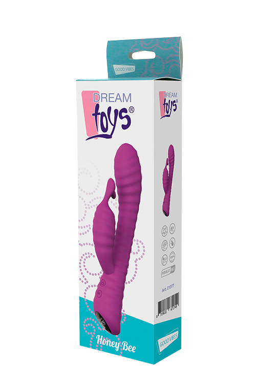 The Honey Bee vibrator is made of body safe silicone and has a ridged surface all over the toy. The Honey Bee has 2 powerful motors, offering 9 different vibration patterns. One motor is in the shaft that has a rather big tip and a narrow neck, the other one powers the vibrations in the clitoris stimulator. This stimulator has a special extension, ideally suited for pinpoint stimulation.