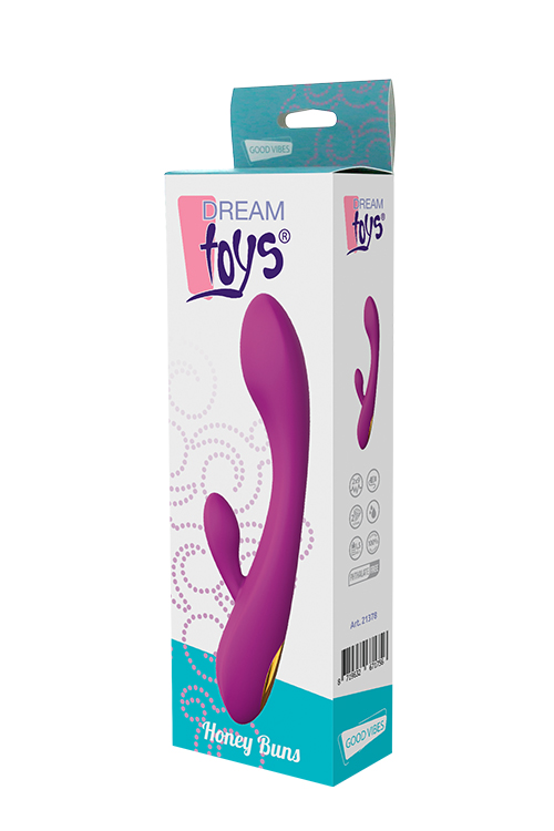 The Honey Buns vibrator is made of body safe silicone and has 2 powerful motors that offer 9 different functions. One motor is in the shaft that has a rather big tip and a narrow neck, the other one powers the vibrations in the clitoris stimulator.
