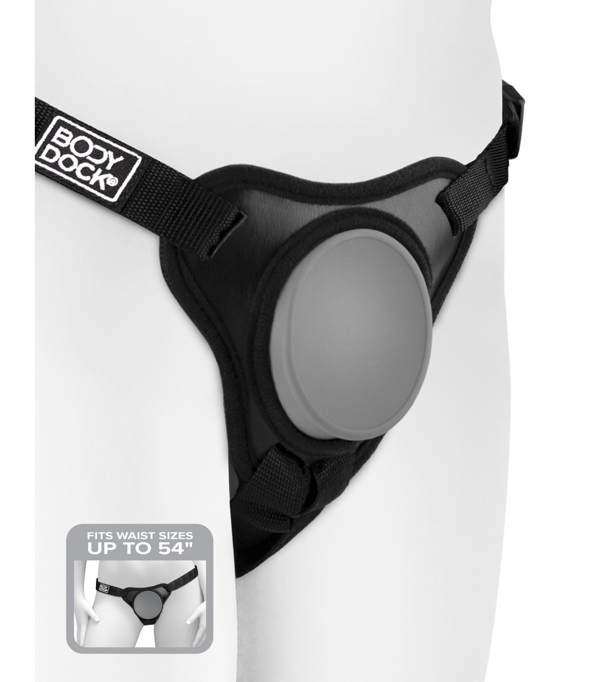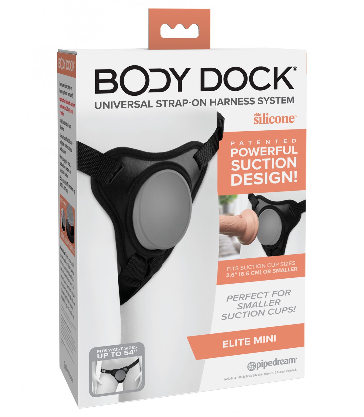 No rings, no clasps, no fuss! Patented PUSH-AND-PLAY powerful suction design! The patented Body Dock® Elite Mini takes strap-on play to a whole new level. It features a premium silicone docking plate that contours to your body, adjustable side buckles, and padded rear support. The Elite Mini was specifically designed for dildos with smaller suction cups and provides a smaller fit. Swapping out your favorite strap-on attachment has never been faster or easier! It’s as simple as snapping the suction cup of your favorite dildo or vibrator onto the docking plate, while the nylon straps easily adjust to fit most body sizes and types. Best of all, it works with most dildos on the market today, including some you may already own. No rings. No snaps. No fuss! Patented suction-based design Press and play! Simply press the suction cup of your favorite dildo or vibrator against the concave suction base until ALL the air between them is released. The suction creates a super strong bond with no rings or clips required! Angled suction plate keeps your dildo erect Body Dock® features an angled suction base to help counteract the sagging caused by traditional harnesses, keeping everything looking as natural and lifelike as possible. • The simplest silicone strap harness system on the market • Optimized for dildos with a suction cup diameter of 2.6 in (6.6 cm) or smaller • Angled suction base keeps dildo erect • Compact and form-fitting silicone body plate adapts to the curves of your body • Strong nylon straps, padded back support and adjustable buckles • Easily adjusts to fit waists up to 54 in (137 cm)