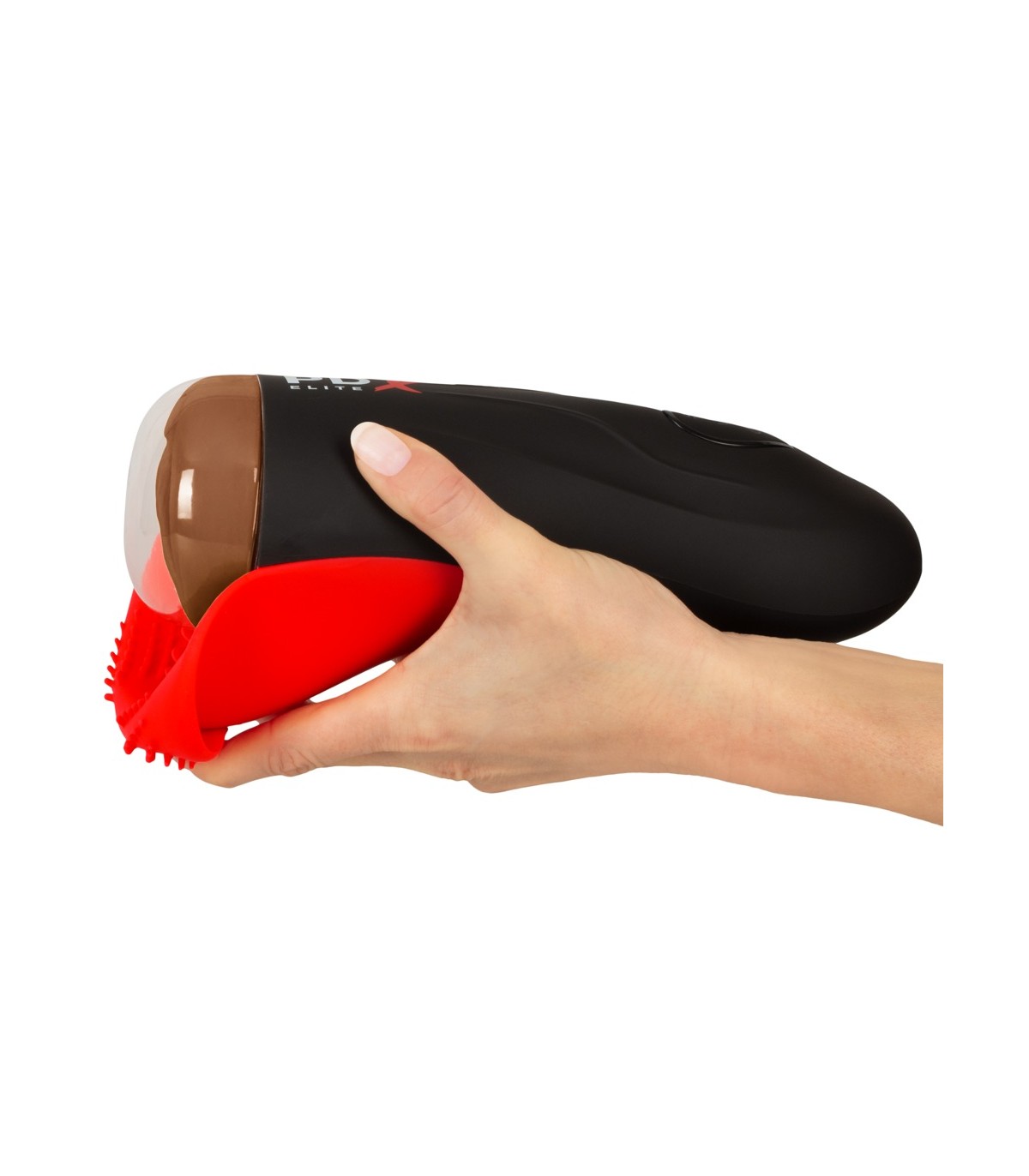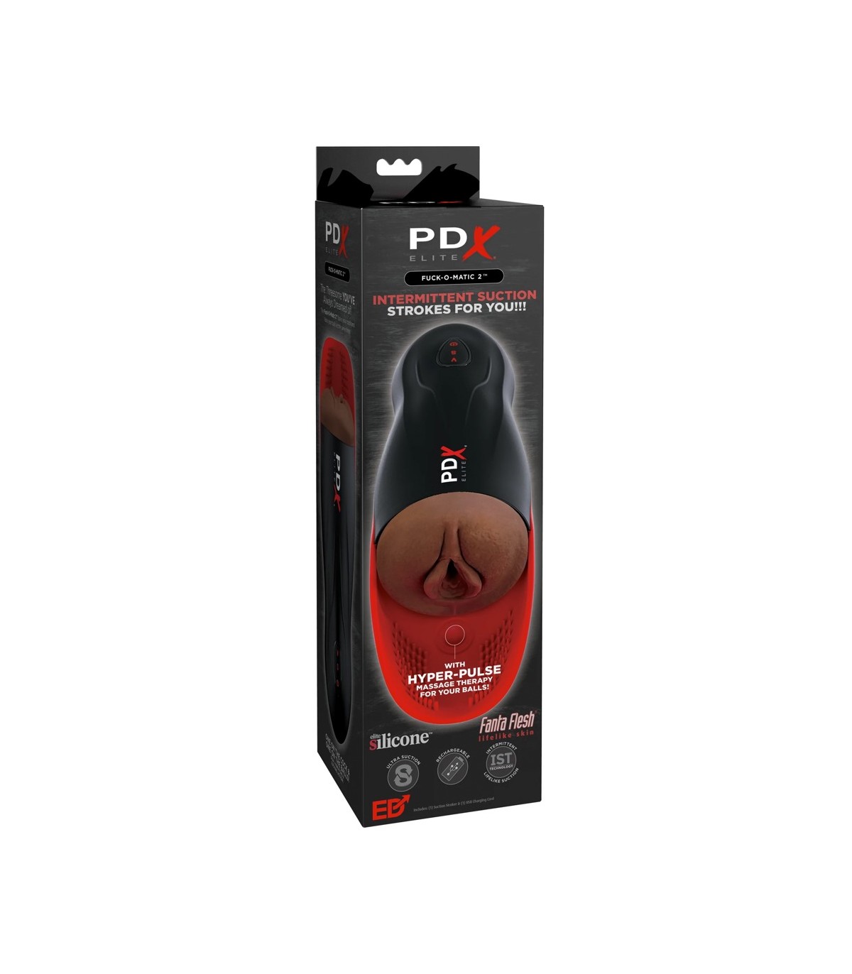 The PDX ELITE® Fuck-O-Matic 2™ elevates masturbation with powerful suction action for the ultimate masturbation experience. It’s a perfect storm of sensations for heightened solo sex sessions that can be customized to your personal mood! Get ready for explosive hands-free vibration that surrounds your testicles with rows and rows of smooth pleasure nubs. Your ultimate masturbation experience will be ready when you are! Our unique “Hyper-Pulse” design concentrates intense stimulation at the base of your testicles. A powerful motor drives the soft silicone diaphragm to create the most intense testicle massage therapy you’ve ever experienced. Simultaneously turn up the intensity with the additional vibrator and prepare to explode with ecstasy! • 5 SUPER STRONG SUCTION MODES Intermittent suction technology slides your penis into the ultra-smooth Fanta-Flesh® vaginal masturbator. As the suction stops, your penis gets the ultimate stroking job, in and out automatically! • 10 VIBRATION MODES Pulsating vibrations simultaneously tingle the tip of your penis. • HYPER-PULSE A soft silicone diaphragm resonates with an intense massage therapy for your testicles. • ELITE SILICONE™ TONGUE TICKLER Gently stimulate with rows and rows of soft silicone nubs that caress your testicles as you slide in and out of the ultra-smooth vaginal lips to heighten arousal. • USB RECHARGEABLE Ready when you are! Easily and conveniently rechargeable with the included charging cable, offering hours of enjoyment