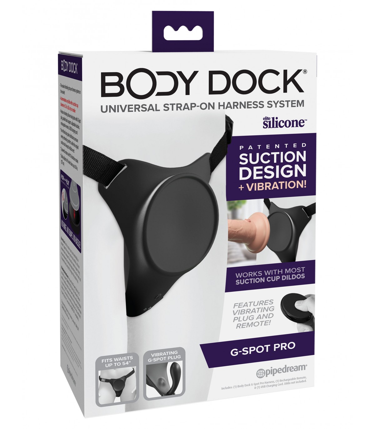 No rings, no clasps, no fuss! Patented PUSH-AND-PLAY suction design + vibration! The patented Body Dock® G-Spot Pro takes strap-on play to a whole new level with VIBRATION! It features padded back support, adjustable side-release buckles, and a premium silicone docking plate with two powerful motors for internal and external stimulation. Now, both partners can enjoy the action, which you can also control with the rechargeable remote! Swapping out your favorite strap-on attachment has never been faster or easier! It’s as simple as snapping the suction cup of your favorite dildo or vibrator onto the docking plate, while the nylon straps easily adjust to fit most body sizes and types. Best of all, it works with most dildos on the market today, including some you may already own. No rings. No snaps. No fuss! Patented suction-based design Press and play! Simply press the suction cup of your favorite dildo or vibrator against the concave suction base until ALL the air between them is released. The suction creates a super strong bond with no rings or clips required! Angled suction plate keeps your dildo erect Body Dock® features an angled suction base to help counteract the sagging caused by traditional harnesses, keeping everything looking as natural and lifelike as possible. • The easiest vibrating strap harness system on the market! • Fits any dildo with a suction cup diameter of 3.4 in (8.6 cm) or smaller • Features a vibrating silicone body plate with G-spot plug, padded rear support, adjustable buckles, rechargeable remote control and USB charging cable • The form-fitting body plate distributes pressure, evenly enhancing comfort, while the angled suction base keeps the dildo erect • 2 powerful motors with 10 vibration modes • Easily adjusts to fit waist sizes up to 54 in (137 cm)