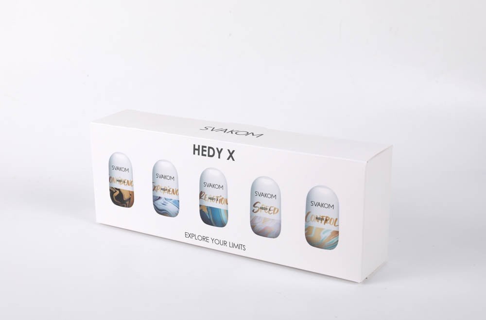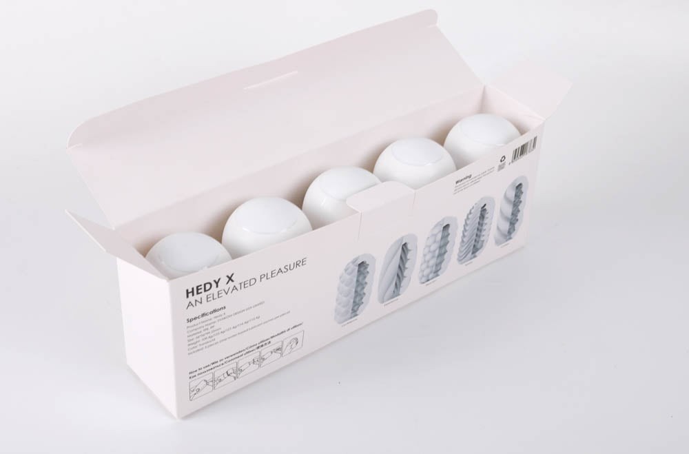 Hedy X series is a collection of 5 sleeves, each carefully designed with a unique interior for a supreme experience. Unwrap, lube it up and indulge! 5 unique textures that will take you to a new high. Double-sided structure brings dual glees. Ultra-soft material, a realistic mighty touch. Reusable up to 10 times. Thickened material for an elevated sensation. Stretchable – One size fits all. Ultra-discreet look. Easy to clean: self-drain case. A special lube sachet included with every piece