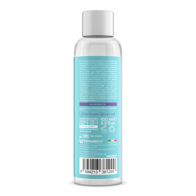 Intymate – Puro Hyaluronic, 100 ml è un lubrificante a base acquosa con Acido ialuronico ultra fluido e ultra scorrevole ideale per favorire la lubrificazione durante i rapporti intimi.