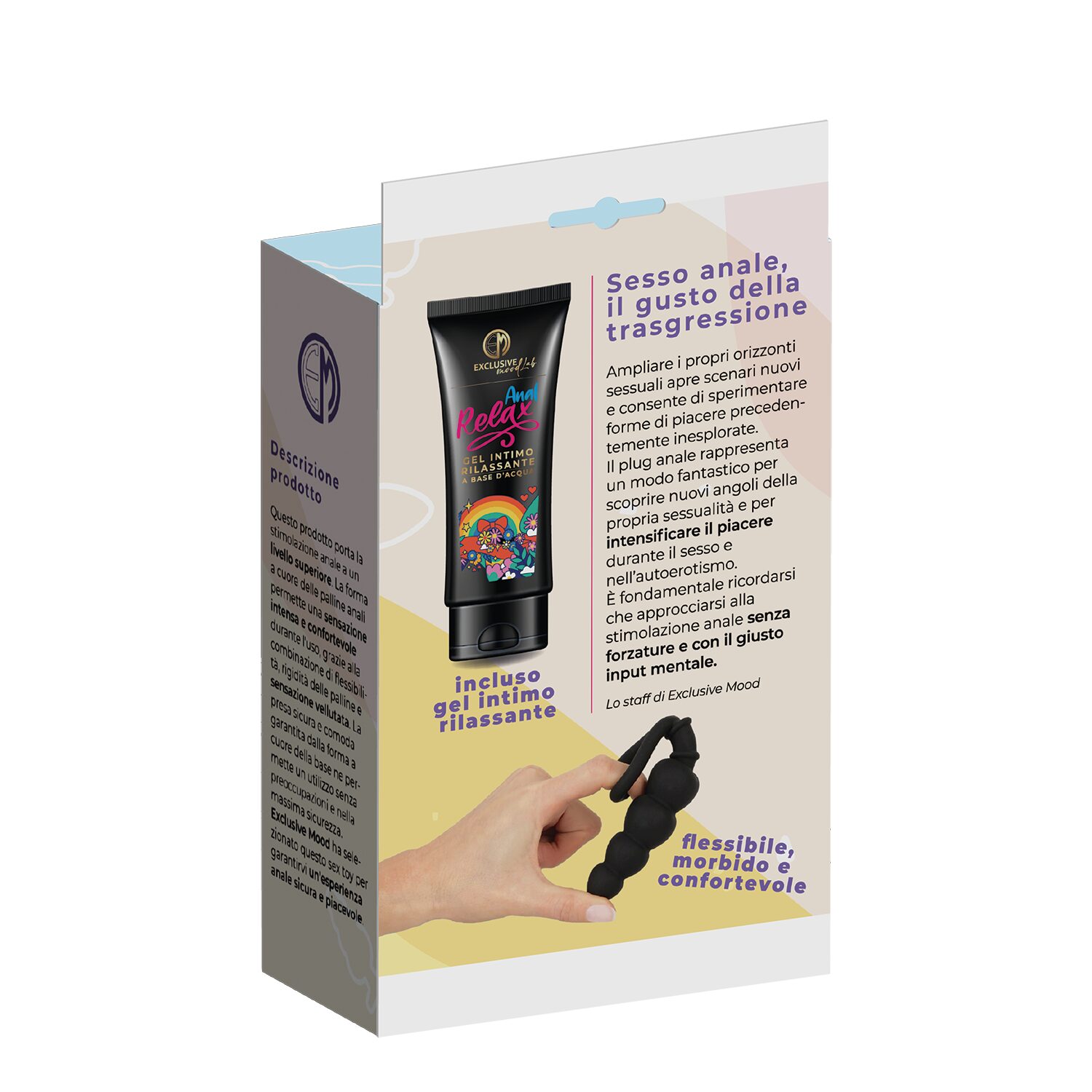 • Gel “Anal Relax”: la nostra formula esclusiva, arricchita con ingredienti lenitivi, renderà ogni momento di esplorazione ancora più piacevole, permettendoti di lasciarti andare al piacere senza preoccupazioni.
