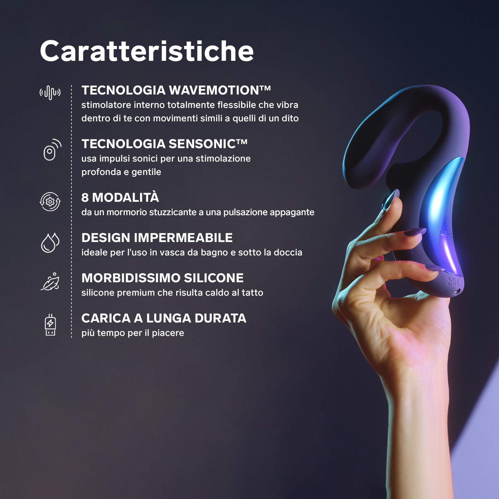 ENIGMA Wave, l'ultima edizione della leggendaria gamma ENIGMA, è un massaggiatore sonico a doppia stimolazione e ricco di azione, dotato di un aggiornamento spettacolare.