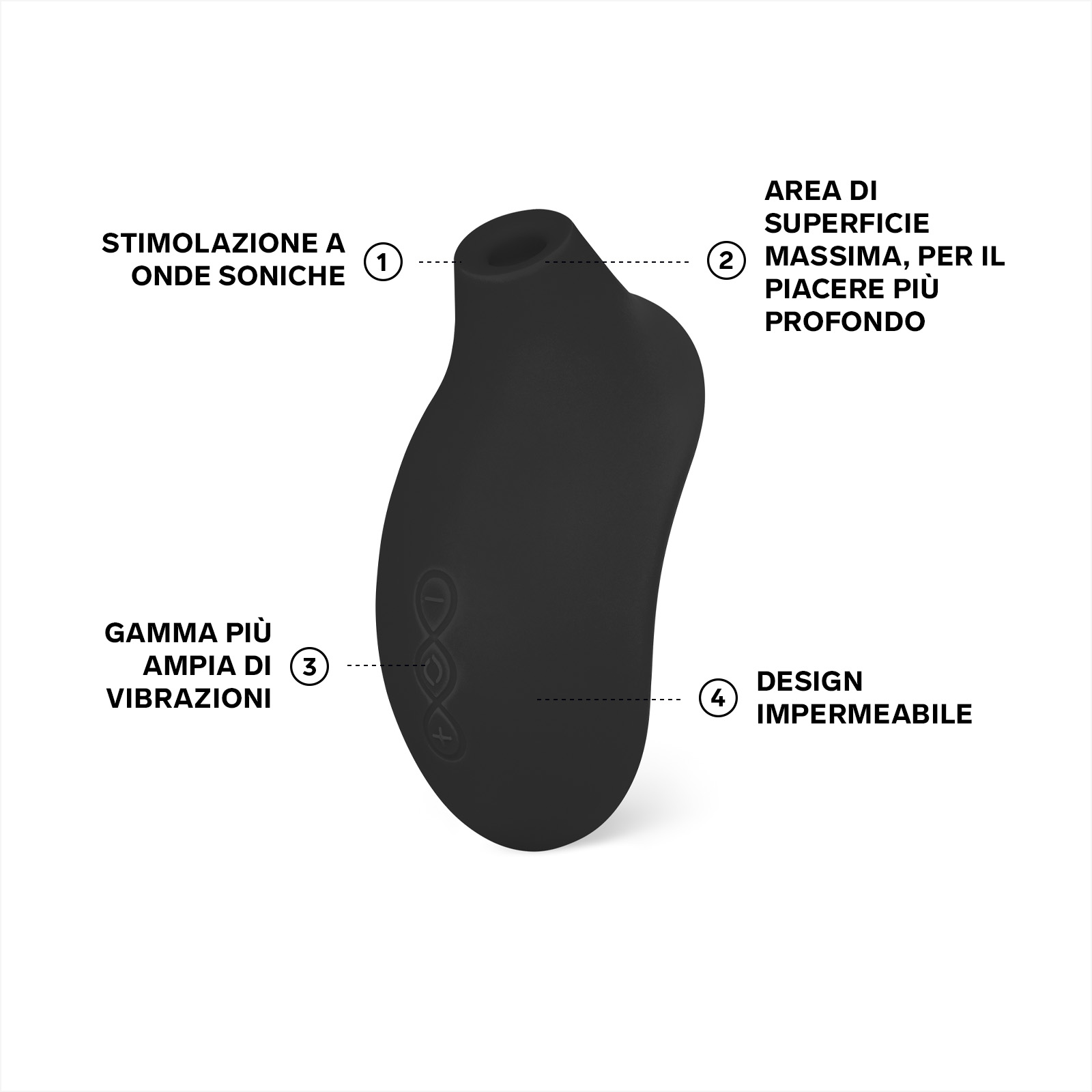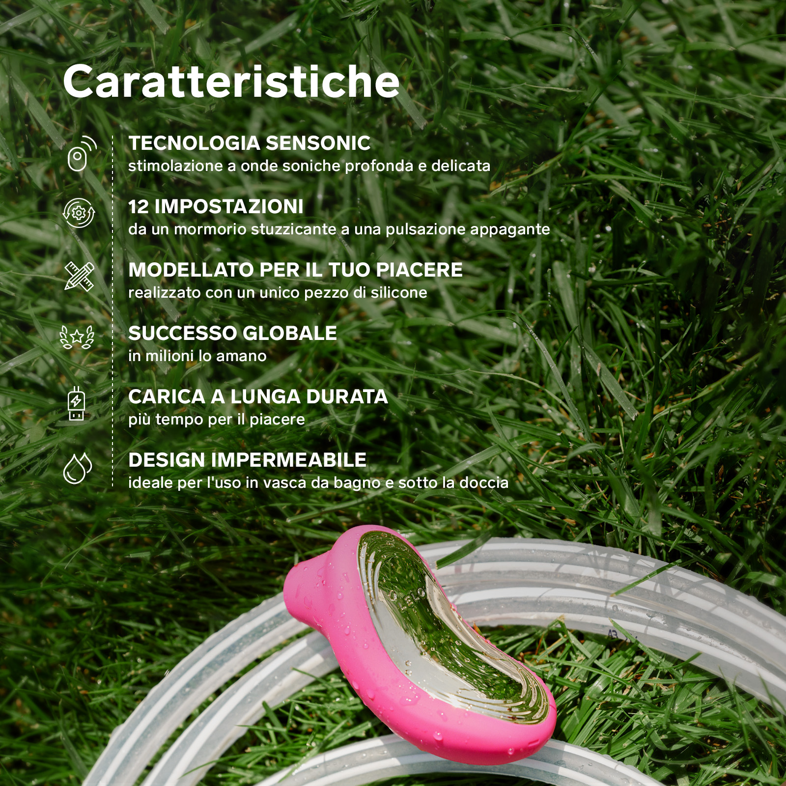Il suo design elegante e impermeabile è composto da un unico blocco di silicone premium, morbidissimo, che rende SONA 2 incredibilmente piacevole da tenere in mano e facile da maneggiare.