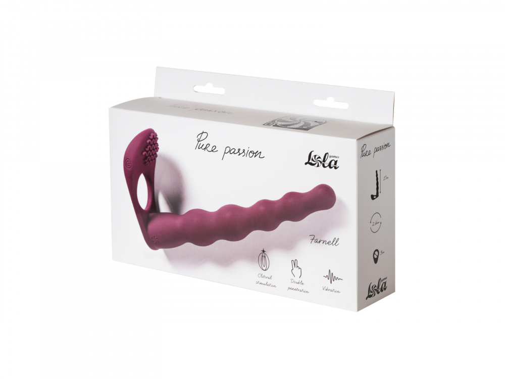 Dildo per doppia penetrazione Farnell realizzato in silicone anallergico. Forma in rilievo e flessibile. È fissato saldamente alla base del pene grazie all'anello in silicone rimovibile. L'anello si adatta a qualsiasi dimensione. Un bullet vibrante è situato nella parte superiore per la stimolazione del clitoride. È alimentato dalle batterie AAA incluse nella confezione.