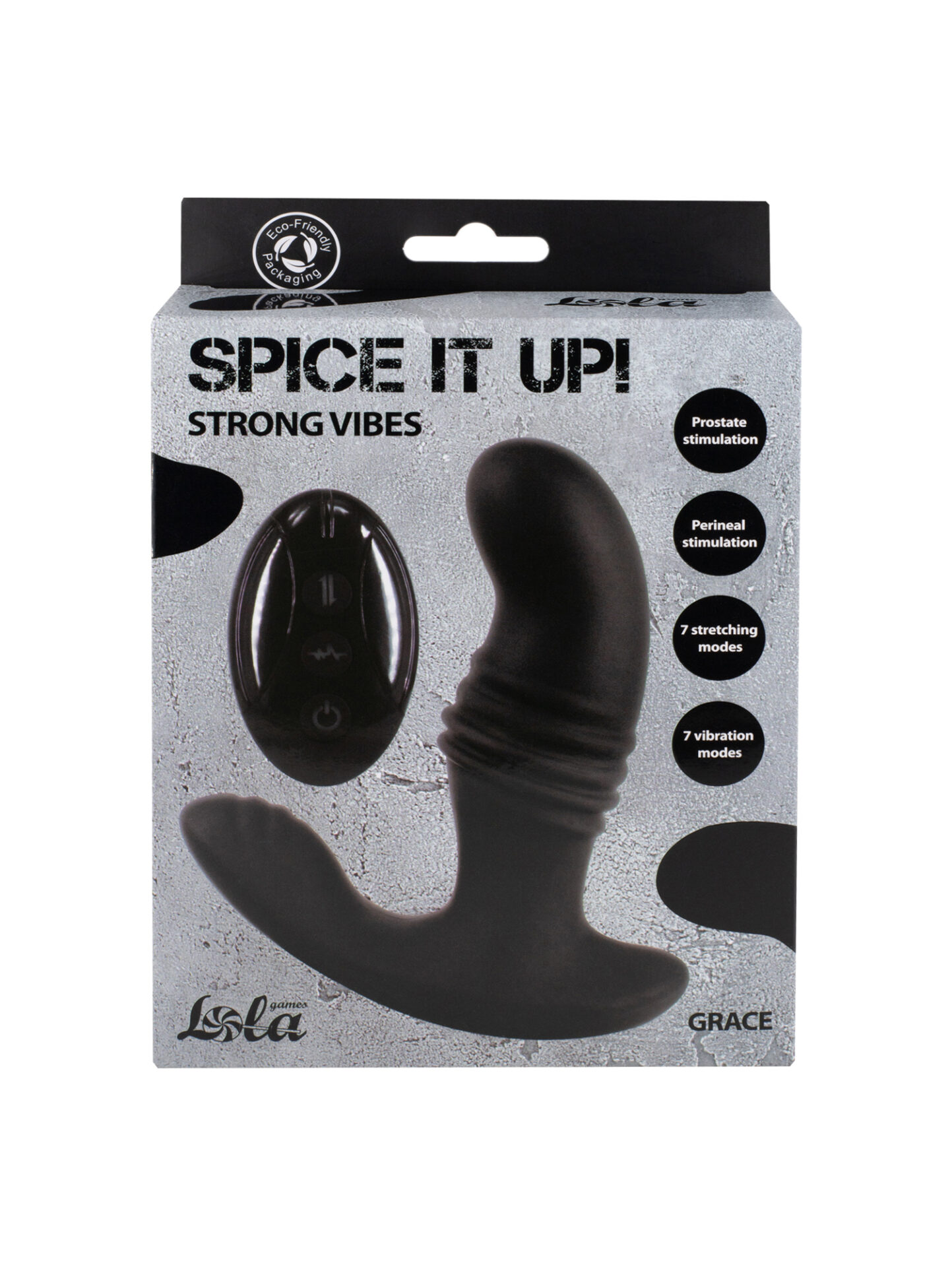 Spice it Up Grace è uno stimolatore prostatico in silicone impermeabile con telecomando. I due motori sono dotati di 7 modalità di vibrazione e allungamento rendendo Grace un dispositivo potente e piacevole da usare. La parte penetrante è anatomica e con una punta curva. Il massaggiatore viene caricato da un caricatore magnetico, il telecomando funziona a una distanza massima di 15 metri. Tempo di utilizzo: 60 minuti.