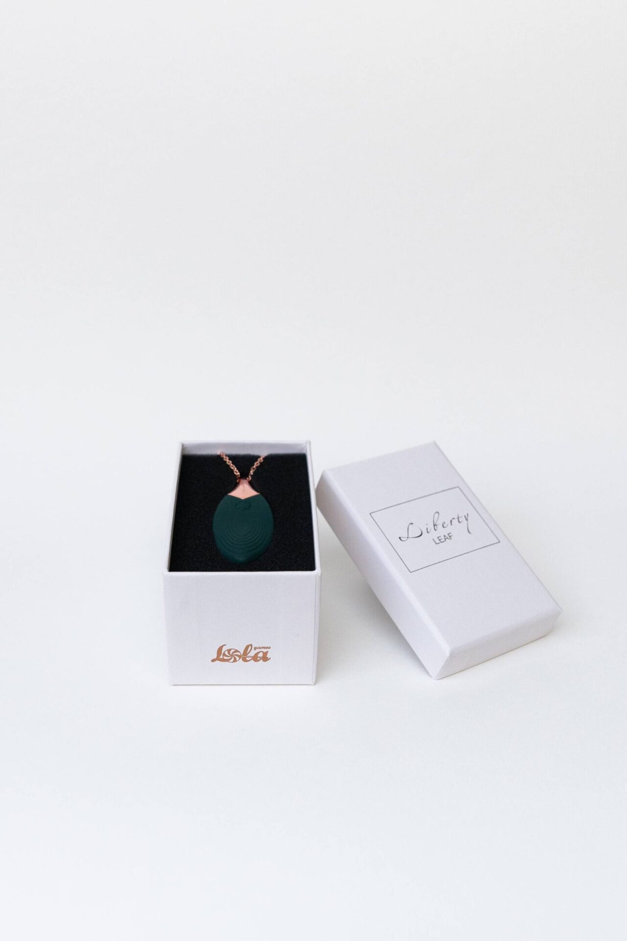 Elegante e provocante vibratore a forma di foglia verde che può essere indossato come una collana.