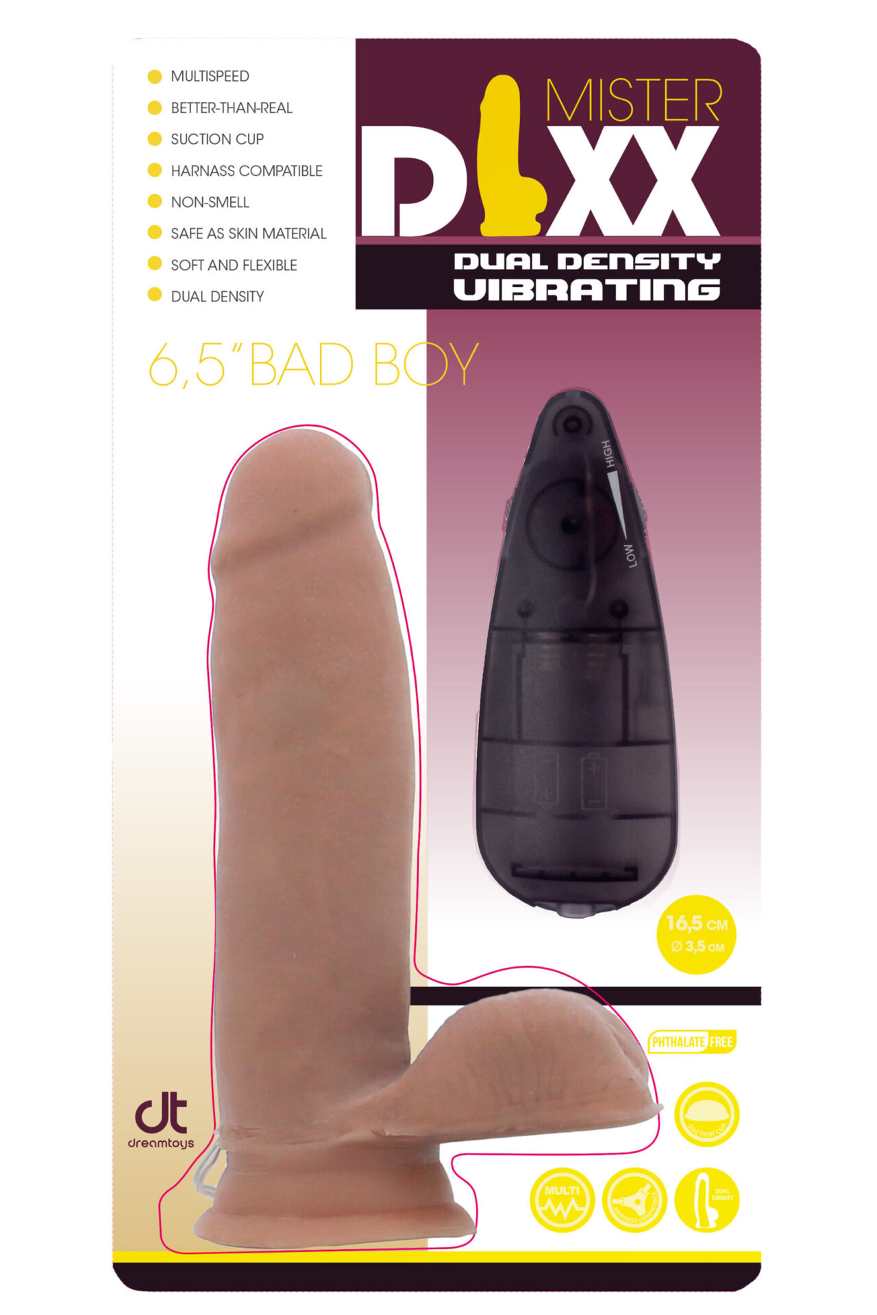 This 6.5 inch Mr Dixx Dual Density dildo is called Bad Boy and has a firm core with a softer, lifelike outside. This is called Dual Density and it adds to the experience during use: penetration will feel like it’s the real thing!  Flexible dildo with a realistic feel and strong multispeed vibrations, steplessly adjustable with the remote control.  The strong suction cup base sticks firmly to any smooth, flat surface. This dildo is  compatible with strap-on harnesses. Made of anti-bacterial TPE, free of phthalates and latex, non-smelling and body safe.