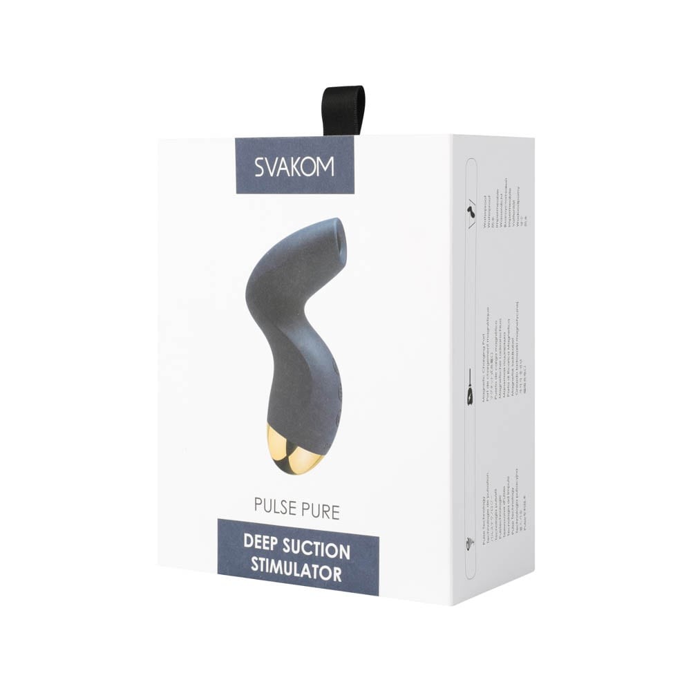 Pulse Technology SVAKOM’s newest patented technology is excited to show you just what it can do. Experience the deepest pleasure you have ever felt with targeted suction sure to elicit the deepest of moans. Fast or slow, experience suction deeper than ever before. 5 exhilarating modes each with 5 levels of intensity. Cool down and get ready for your next adventure with ease. Water resistant, Pulse Pure is simple to clean and ready when you need it. Soar delicately towards the deepest climax. Pulse Pure is made from ultra-soft silicone perfectly designed for smooth sessions. Wrap your fingers around the slender `S` shaped body of Pulse Pure and let pleasure bloom anew. Pulse Pure is designed for comfortable handling and easy to maintain grip – letting you try out every single angle.