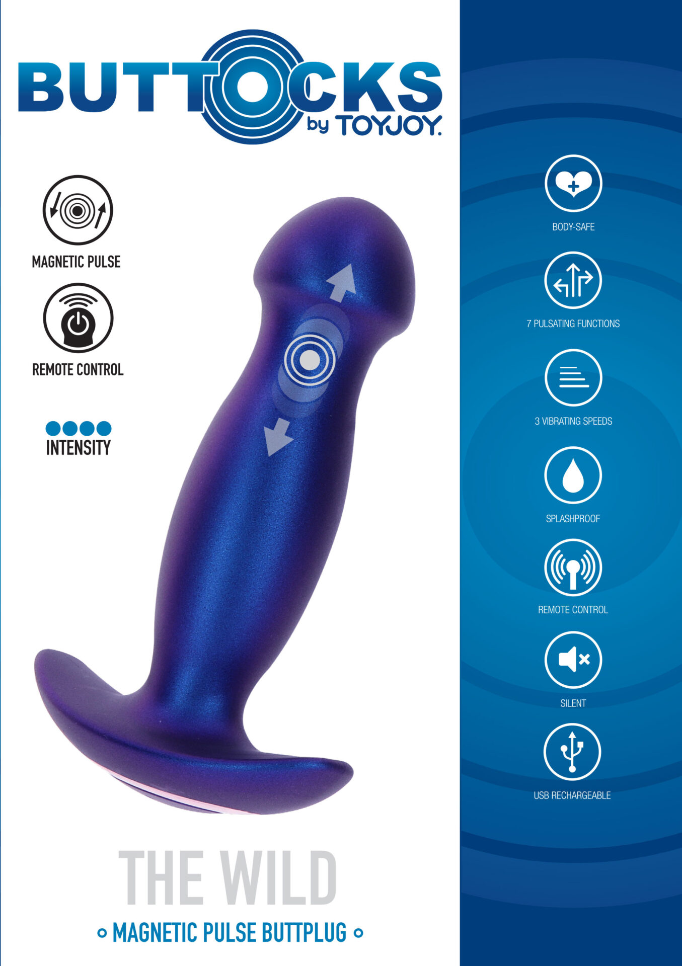 The Wild is a thrusting and vibrating anal plug, featuring a powerful motor with 7 different pulsating modes and 3 vibrating speeds. Each mode offers deep rumbling vibrations and mind-blowing magnetic pulse movement, which are easily controlled on the item or with the included remote control. The powerful magnetic pulse function offers extra intensity to your backdoor adventure. Buttocks by TOYJOY is a premium line of high-performance butt plugs, created with a variety of special features to boost your anal pleasure. Buttocks by TOYJOY is the perfect choice for next-level anal stimulation.