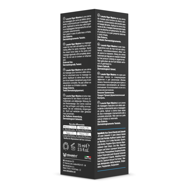 Vigor Maximo XXL è una crema che aiuta a far aumentare il volume del pene. Applicando il prodotto con regolarità, il pene apparirà più voluminoso e vigoroso. La sua formulazione, a base di materie prime dalle elevate proprietà elasticizzanti, stimola l’afflusso di sangue nei campi cavernosi del pene. Per avere risultati duraturi è consigliabile l’applicazione quotidiana, con un massaggio che consenta al prodotto di essere assorbito in profondità.