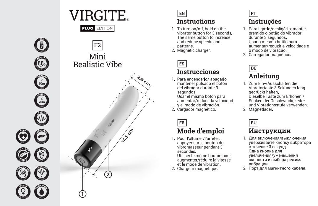 – 7 modalità di vibrazione controllate da un solo pulsante (premere 3 secondi per accenderlo/spegnerlo).
