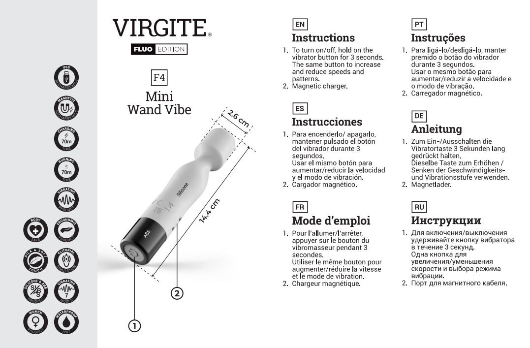– 7 modalità di vibrazione controllate da un solo pulsante (premere 3 secondi per accenderlo/spegnerlo).