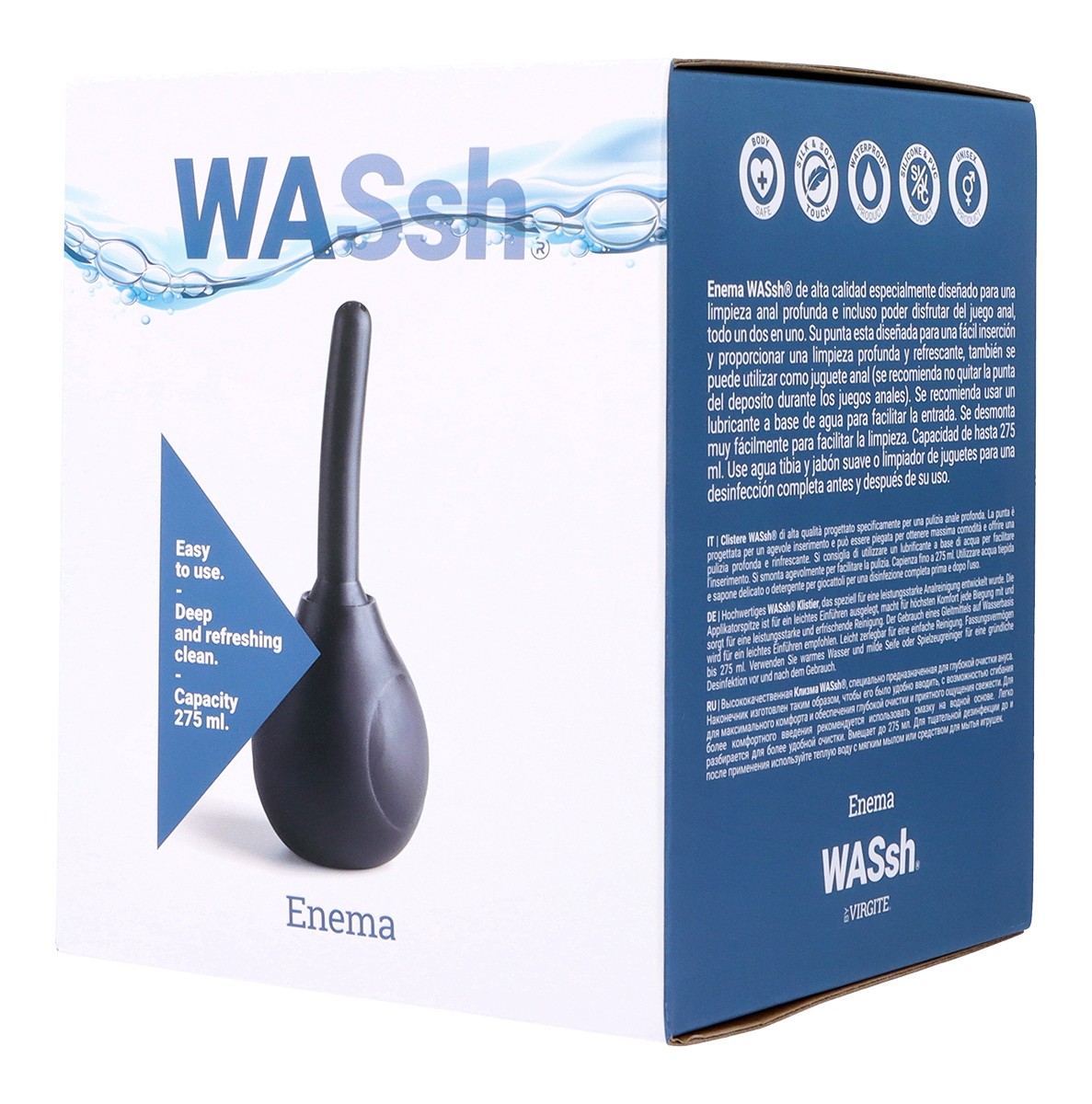 Ottieni una pulizia anale ottimale con la gamma di clisteri Washh. A seconda del gioco a cui giocherai, puoi scegliere la dimensione e la capacità del clistere.