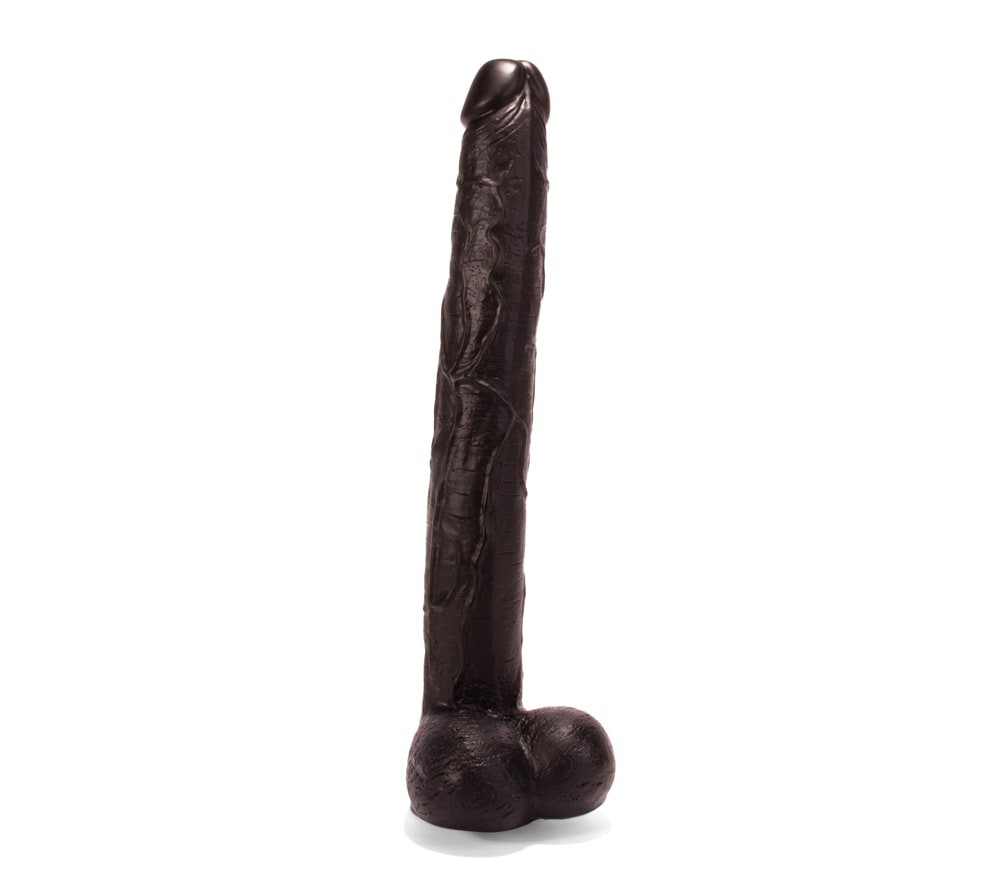 A high quality, large dildo with a skin-like feel, made of a material similar to body tissue, without a motor, with a veined surface and with added testicles. Its suction cup can be attached to a flat surface.